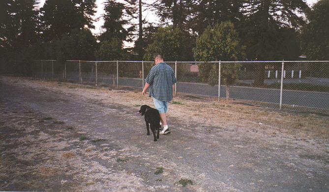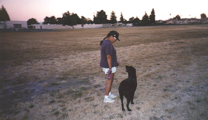 Meggie is definitely the kind of dog who needs a walk often. Unfortunately, we have such odd schedules that we don't get to walk her as much as we like. But when we do walk her, we head out to the school field not too far from home. Meggie's not a good leash walker right now (she likes to run here and there and just can't do a straight line), but when she's off the leash, she's great! We like to tire her out as much as possible. That way when we get home, she's pooped and happy! :)